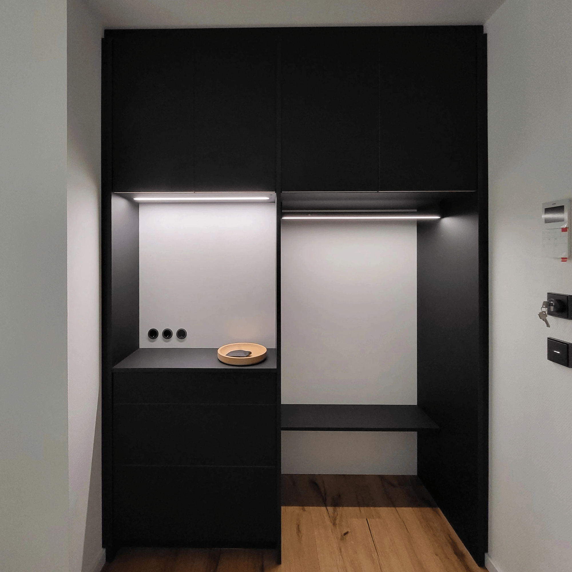 Passgenau für die Nische im Flur. Stauraum hinter Türen und im Schubkastenelement. Indirekte LED-Beleuchtung im Ablagebereich und über der Kleiderstange.