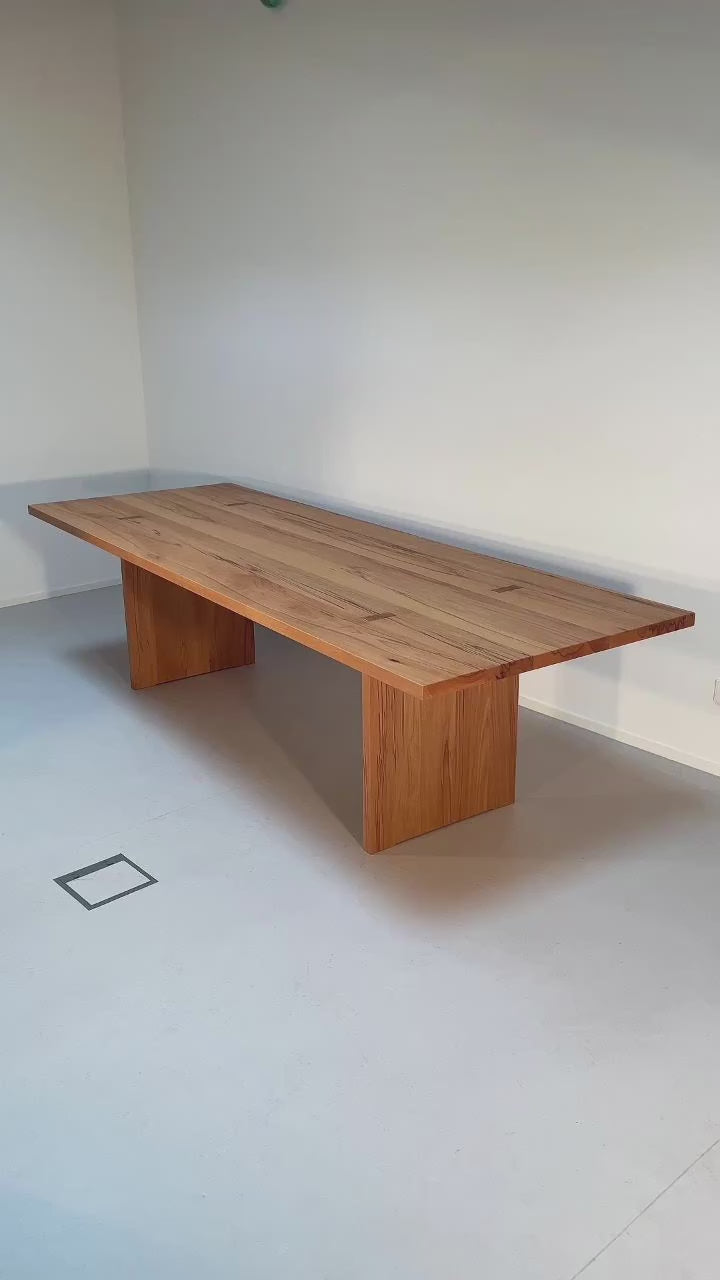 Tisch aus massivem Altholz, handwerkliche Klasse und traditionelle Verbindungen wie zum Beispiel durchgestemmte Hirnholzelemente als Highlight einer massiven Platte. Mit 5 Teilen und wenigen Schrauben ist der Tisch ZEN/10 somit in kürzester Zeit aufgebaut. Innovative Übergänge von Füßen und der Platte verleihen dem Tisch daher Stabilität und wirken durch Ihr reduziertes Design edel und elegant.